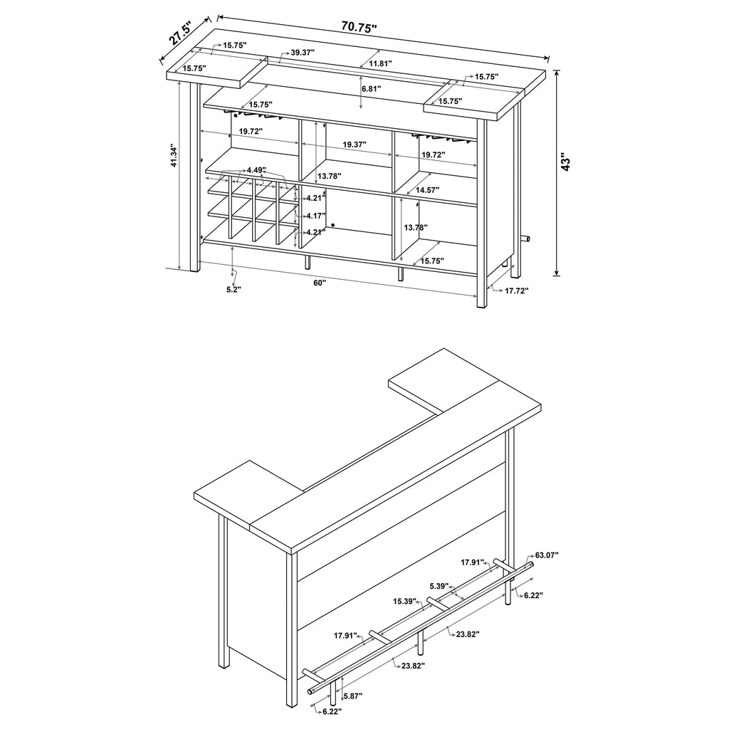Create a home bar in your modern farmhouse home with this rustic bar unit. Perfect for entertaining, this bar features six stemware racks to hang glasses as well as a wine rack capable of holding up to 12 bottles from your favorite vineyards. Pull up a pair of barstools resting your feet comfortably along the steel footrest. With a spacious U-shaped design, you can stand behind and serve beer or make up some craft cocktails, serving guests and yourself. Throughout this bar unit furniture piece is a plank like surface in a weathered rustic oak finish, making it ideal for rustic homes.