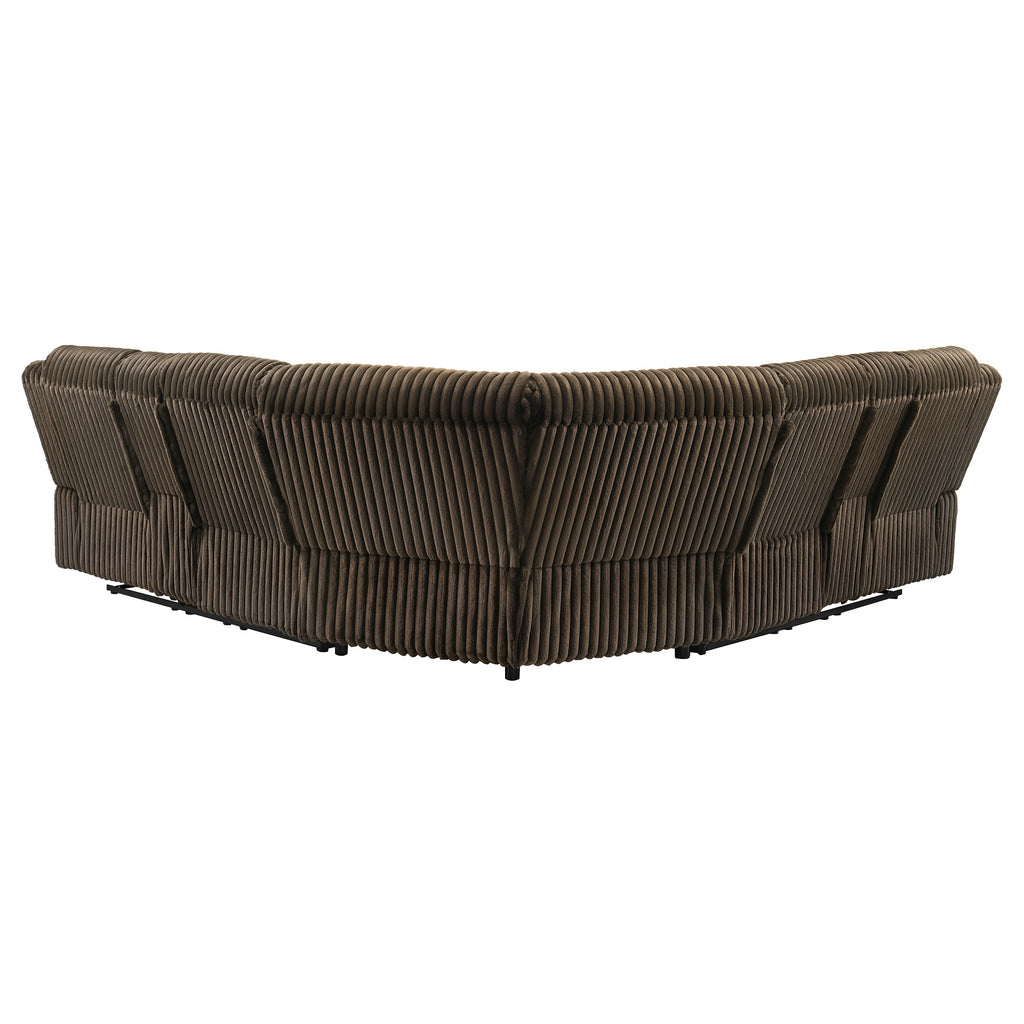 Unwind in sculpted comfort with this reclining sectional sofa, where bold texture meets irresistible softness. Wrapped in wide-wale corduroy upholstery, its velvety ribbed finish creates visual depth and an inviting touch. Deep channel tufting enhances the plush profile, while dual consoles offer lift-top storage and stainless steel cup holders. With pocket coil seating beneath every cushion, this sectional is a luxurious retreat for everyday lounging and connection. Key Features: • Reclining sectional sofa with sculpted profile and ribbed channel tufting throughout each panel • Chocolate brown wide-wale corduroy upholstery offers soft velvety texture and elevated visual interest • Two reclining seats provide effortless comfort with smooth manual motion functionality • Pocket coil seating ensures enduring structure, bounce, and all-day supportive comfort • Two center consoles with lift-top storage and removable stainless steel cup holders included • Reinforced with soft fabric, foam cushioning, and sturdy metal framework for lasting use