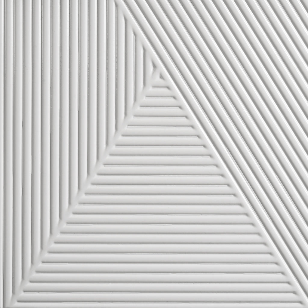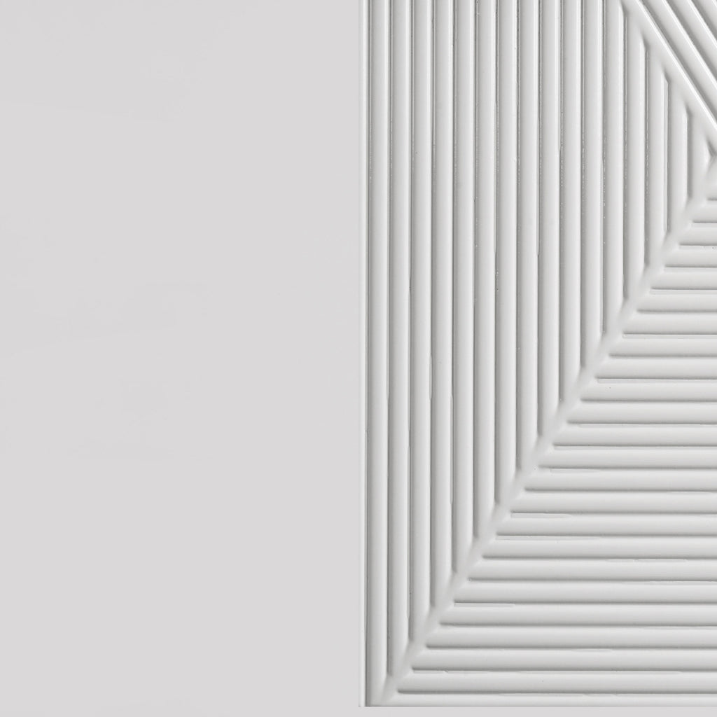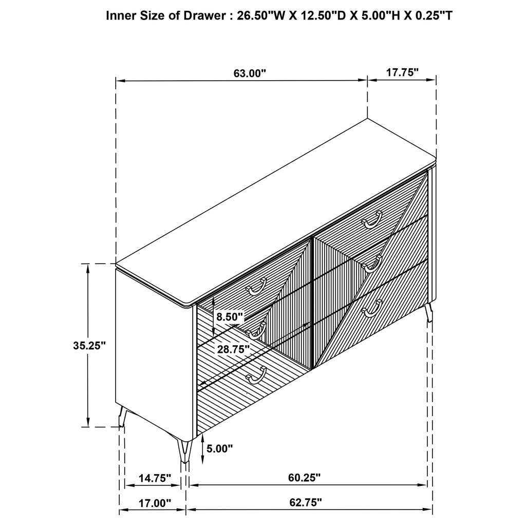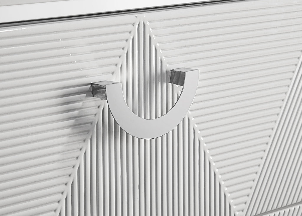 Sleek and sculptural, this six-drawer dresser pairs crisp white high gloss with dimensional detail for a bold modern look. Its geometric drawer fronts feature ribbed textures forming inverted V patterns, highlighted by polished chrome U-shaped pulls. Felt-lined top drawers add a refined interior touch, while smooth-gliding drawers operate on 45mm metal extension glides hardware. Finished with slender legs and clean lines, this dresser brings texture and brightness to contemporary bedrooms. Key Features: • Six-drawer dresser in white high gloss finish with geometric ribbed drawer front textures • Black felt-lined top drawers provide protective storage for delicate items or accessories • Equipped with 45mm metal extension drawer glides for smooth and durable performance • Polished chrome U-shaped drawer pulls add visual contrast and modern refinement • Distinctive V-pattern ribbing enhances the sculpted look of the front panel surfaces • Crafted from engineered wood for sleek finish and reliable support