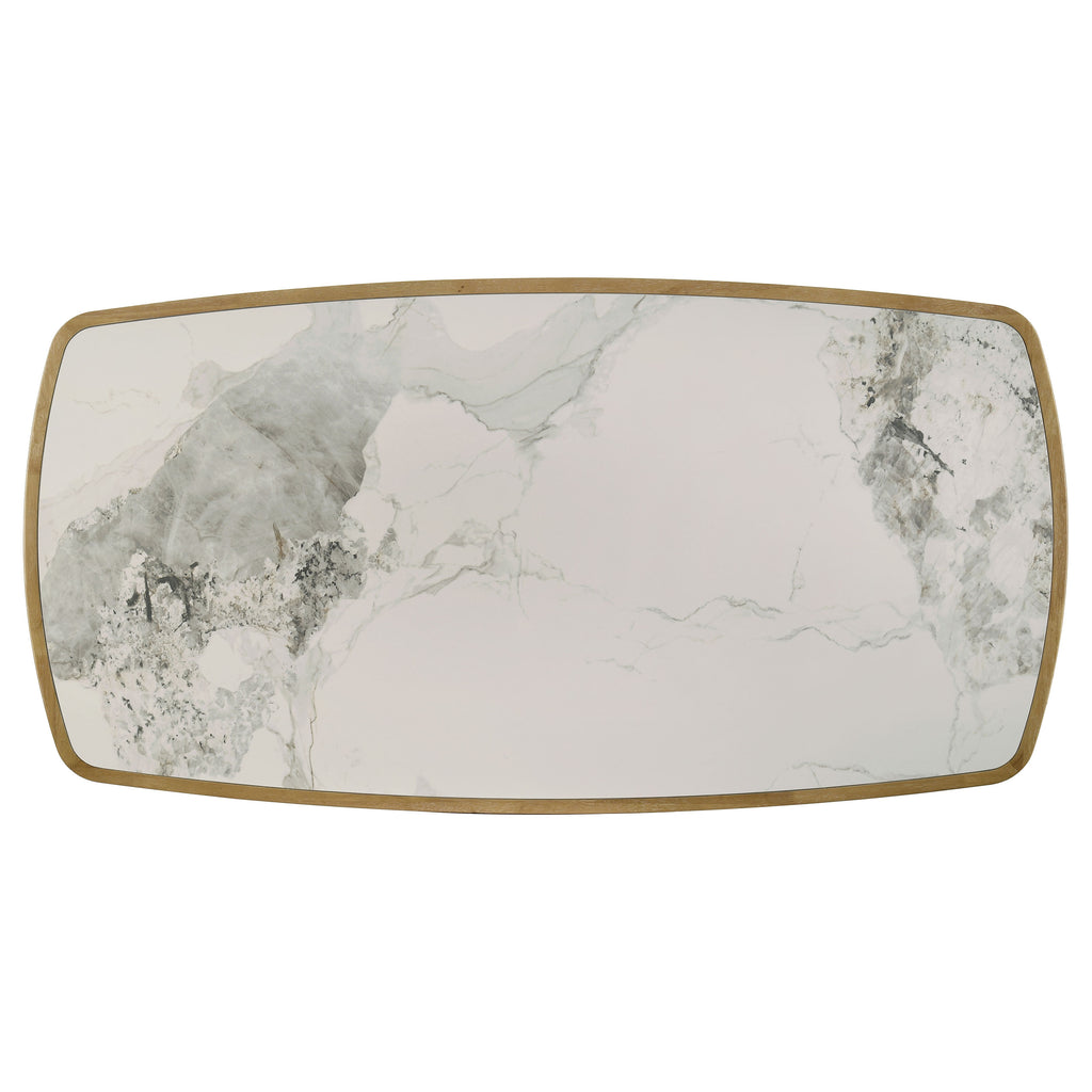 This mid-century inspired dining table blends sculptural elegance with modern innovation. The rectangular tabletop features a recessed ceramic inlay with natural marbling in tones of off white, grey, and amber brown, resistant to heat and stains with an impermeable, easy-clean surface. A softly curved solid wood frame in weathered natural finish surrounds the top, supported by angular legs with slatted stretchers for added character. Crafted from rubberwood and durable composites, it seats six comfortably for everyday dining. Key Features: • Rectangular dining table with ceramic inset top and mid-century inspired frame silhouette • Recessed ceramic surface features marbled tones of off white, grey, and amber brown • Ceramic is heat resistant, impermeable, and easy to clean for everyday functionality • Top is framed in solid wood with curved edges that soften the tabletop profile • Angular legs with slatted accents add visual flair and classic modernist influence • Crafted from solid rubberwood, engineered wood, and ceramic composite materials