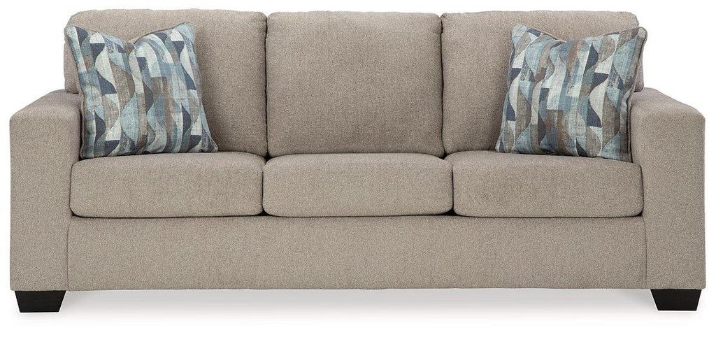 You’re in for a neat treat with this sofa. Its comfy seats are covered in soft, textural upholstery, and the wide track arms are eager to support your quest for total relaxation. Distressed abstract toss pillows bring a fresh breath of contemporary style while accentuating the sofa's color.