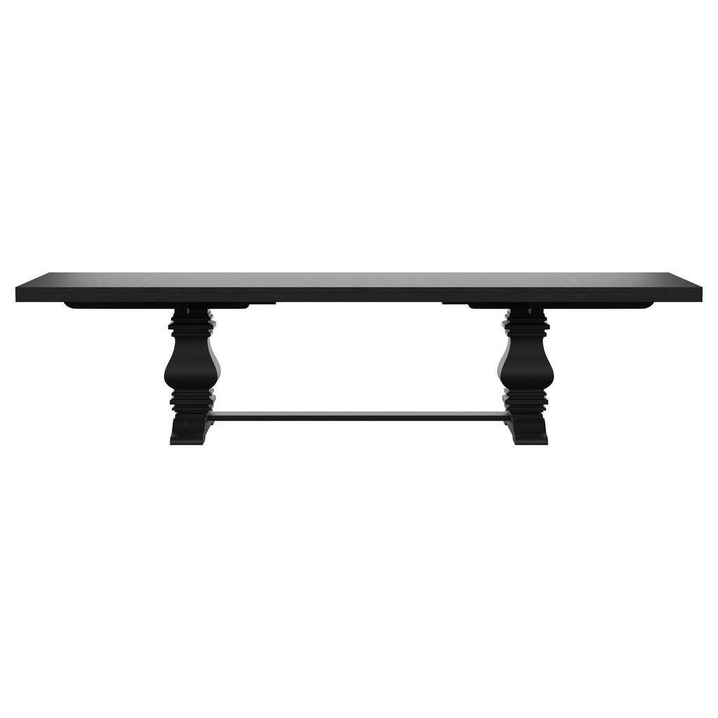 Transform your dining space with the perfect blend of timeless elegance and modern comfort. This dining set showcases a stately rectangular table with a double pedestal trestle base, evoking romantic charm and artisanal craftsmanship. The antique black finish lends a dramatic, yet versatile touch to any dining room. Paired with beautifully tufted dining chairs, the set brings a soft, inviting aesthetic, with plush cushioning and a graceful wingback silhouette. Designed for hosting family dinners or special gatherings, the table expands easily with a removable leaf, ensuring ample space for cherished guests. This dining set combines refined detail and functional versatility, creating a warm and welcoming space for every meal. Key Features: • Rectangular dining table with a bold double pedestal trestle base adds a touch of timeless charm • Antique black finish adds rich drama and refinement to your dining room décor • Decorative plank-style tabletop includes a removable 16-inch extension leaf for added versatility • Beige fabric upholstered tufted dining chairs with a classic wingback silhouette provide both comfort and style • Nailhead trim and soft upholstery with button tufting on the chairs bring an elegant finishing touch