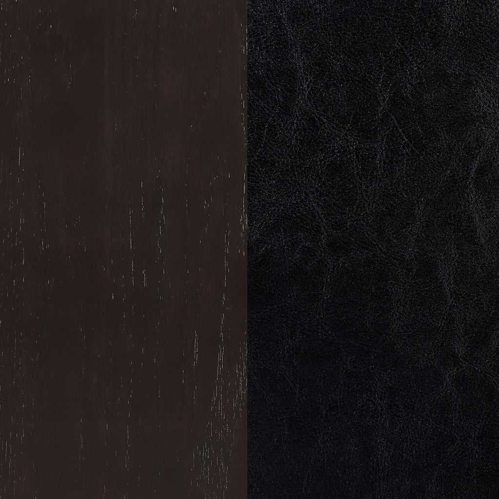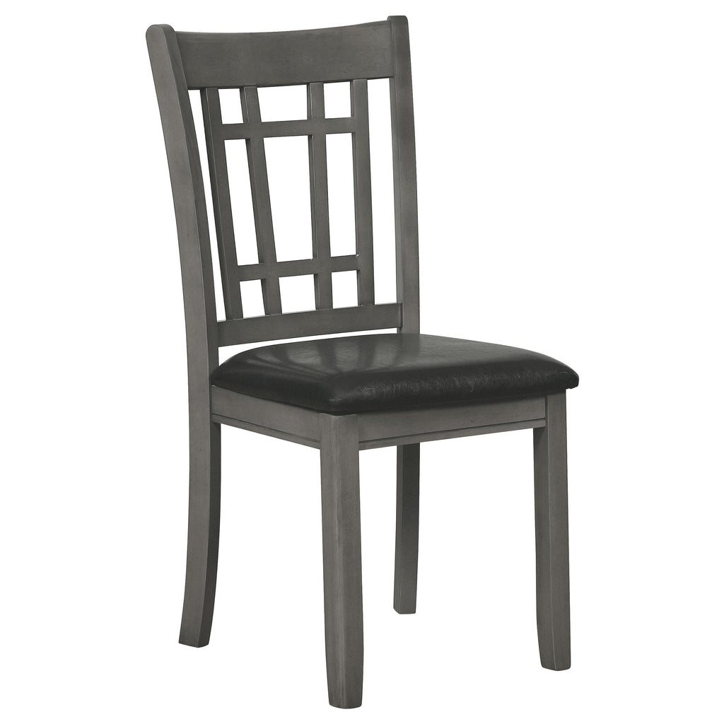 A combination of vertical and horizontal slats creates a window pane effect for this charming transitional dining chair. An armless silhouette is a versatile choice for relaxed, everyday living. The chair boasts a medium grey finish over rubberwood construction. Webbed seating and black faux leather upholstery combine for stylish comfort. Invite friends and family to have a seat and enjoy a lovely meal. Key Features: • Dining side chair with open grid backrest and gently curved back support • Medium grey finish highlights transitional styling and natural wood texture • Black faux leather upholstered seat provides cushioned comfort and easy care • Seat constructed with webbing and frame support for long-lasting durability • Armless profile allows for flexible seating arrangement around any table • Crafted from solid hardwood, engineered wood, and foam-padded leatherette