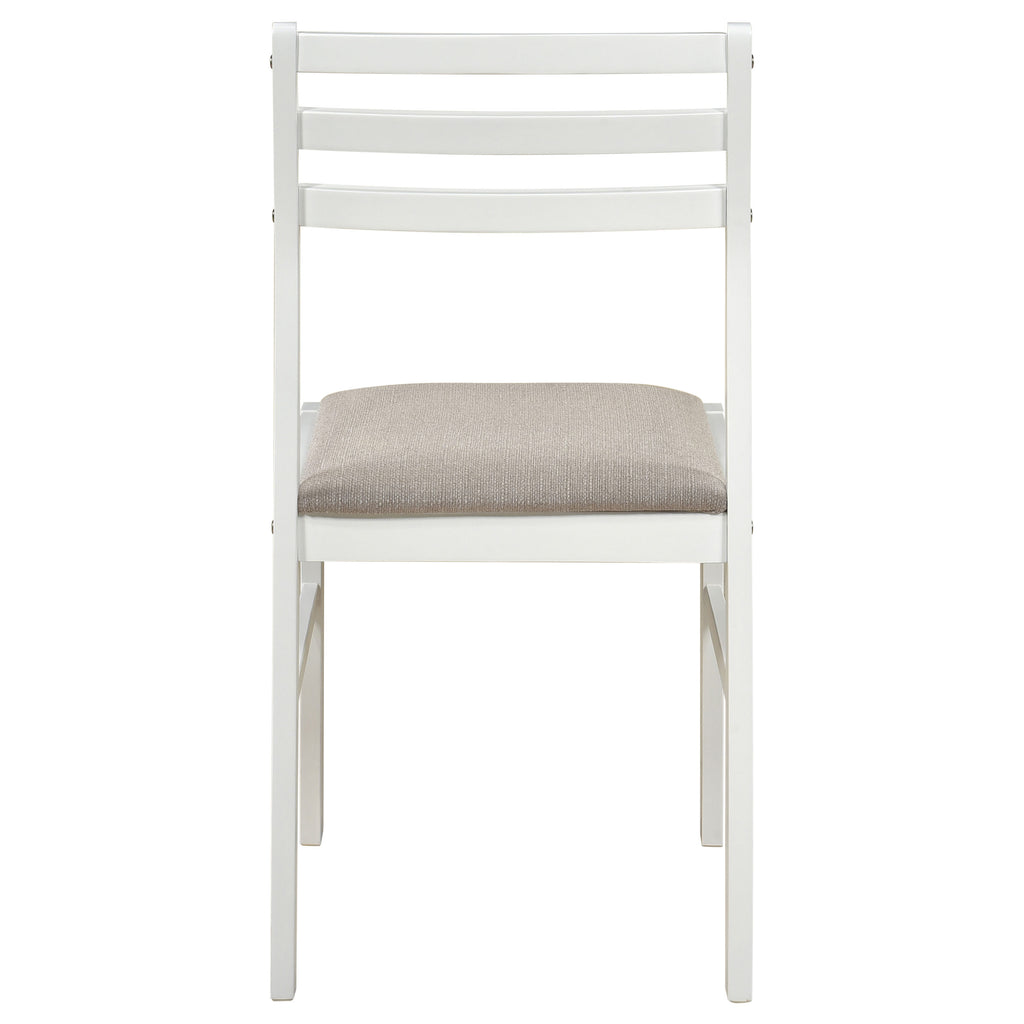This lovely dining set lends an elegant touch of simple sophistication to a kitchen or breakfast nook. It comes complete with a lovely, round dining table and two comfy chairs upholstered in soft, light brown, padded fabric. The table is enhanced by a versatile drop-down extension which can be raised to accommodate an elaborate dining setup. Lowering it allows you to cozy up closely with a special someone over a leisurely breakfast or romantic, candlelit meal. A smooth, polished, natural wood finish gracefully complements the sleek, stylish silhouette of this beautiful three-piece set. Key Features: • Light and airy natural finish dining set is perfect for a casual breakfast nook • Round table with drop down leaves saves space • Chairs feature a contemporary rendition of a ladder back style • Padded seats in tan microfiber • Sold as a three piece all-inclusive set: Table plus two chairs