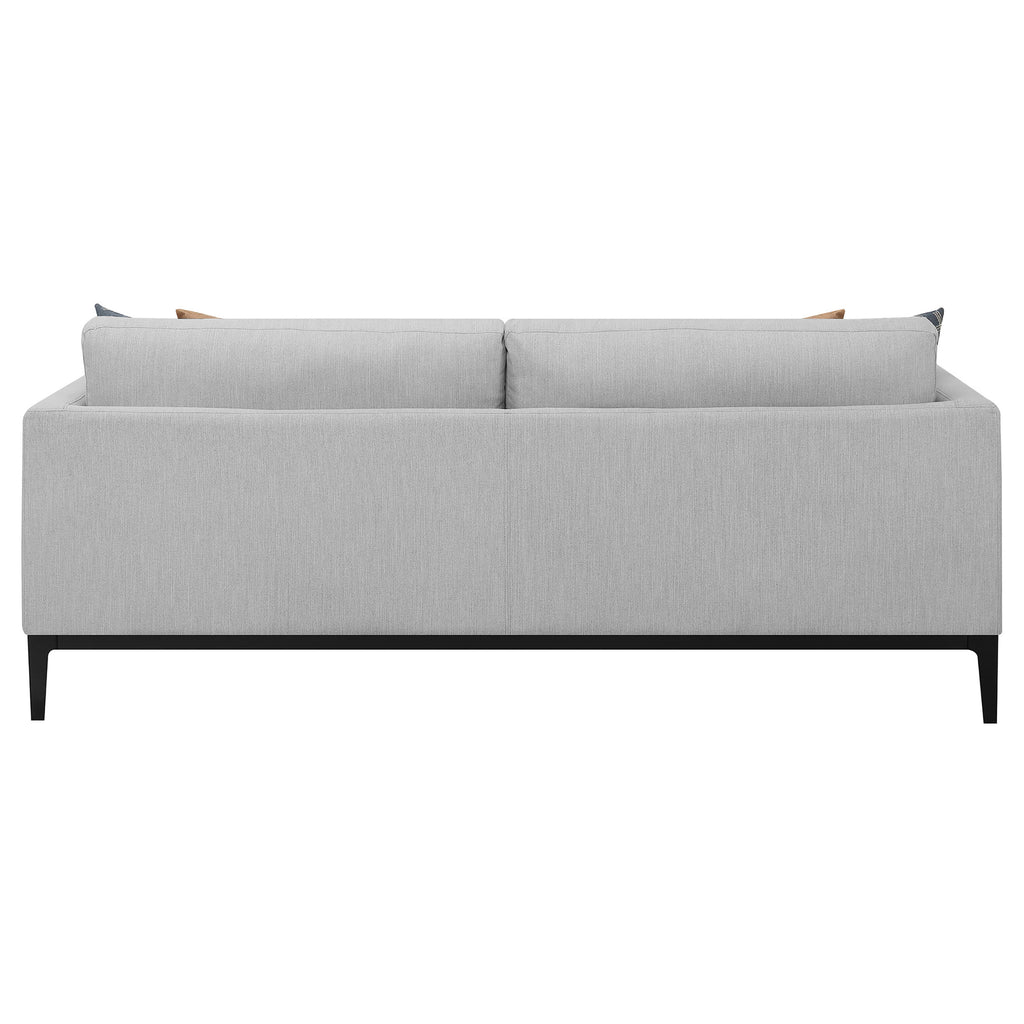 You and your loved ones will be lounging in style on this chic, comfortable sofa. With its understated, transitional design, it blends seamlessly with the decor of any living room. Soft, grey upholstery subtly plays up its simple silhouette. Two matching accent pillows add an exquisitely inviting touch. Complete with soft, plush seat cushions, this sofa takes comfort to the next level. Key Features: • This collection features clean lines and modern track arms for a sleek look • Feather down wrapped cushions provide ultimate comfort • Back and seat cushions are fully reversible for easy cleaning and maintenance • Innovative metal base has been custom designed for this collection for easy leg assembly • Includes down-filled accent pillows in plaid and faux suede fabric