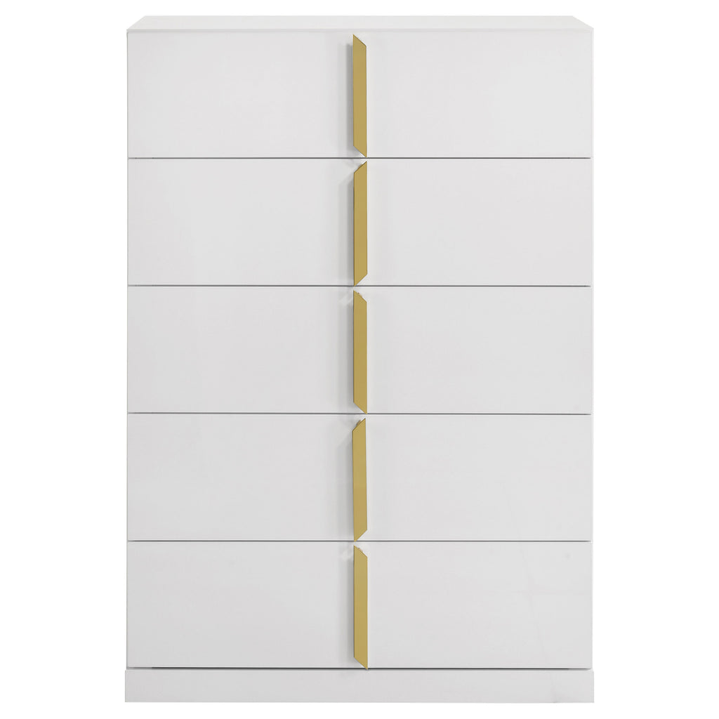 Inspired by Italian contemporary design, this five-drawer chest of drawers blends sculptural elegance with lasting performance. The white high gloss finish is laminated in PET, a high-performance thermoplastic known for its scratch resistance, moisture resistance, and long-term durability. Vertically mounted polished gold pulls add a bold accent, while five spacious drawers provide stylish storage for the modern bedroom. Key Features: • Five-drawer chest of drawers with bold vertical symmetry and Italian-inspired styling • Eco-friendly PET thermoplastic veneer is scratch-resistant and easy to maintain • PET surface resists moisture, heat, and UV exposure without yellowing or warping • Polished gold pulls are vertically mounted for sculptural elegance and contrast • Drawers feature English dovetail joinery and smooth operating metal glides • Fully assembled and includes tip-over restraint for added safety