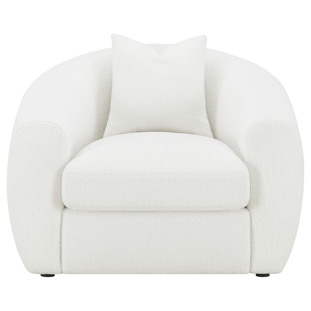 Create your modern entertaining area with this contemporary natural seating set, designed with a boucle fabric across its cloud-like contoured frames, sloped armrests and curved bench seats. Coordinating boucle accent pillows with premium faux down fill offer the finishing touch and extra comfort as contrast bold black legs hidden below elevate each seat ever so slightly.