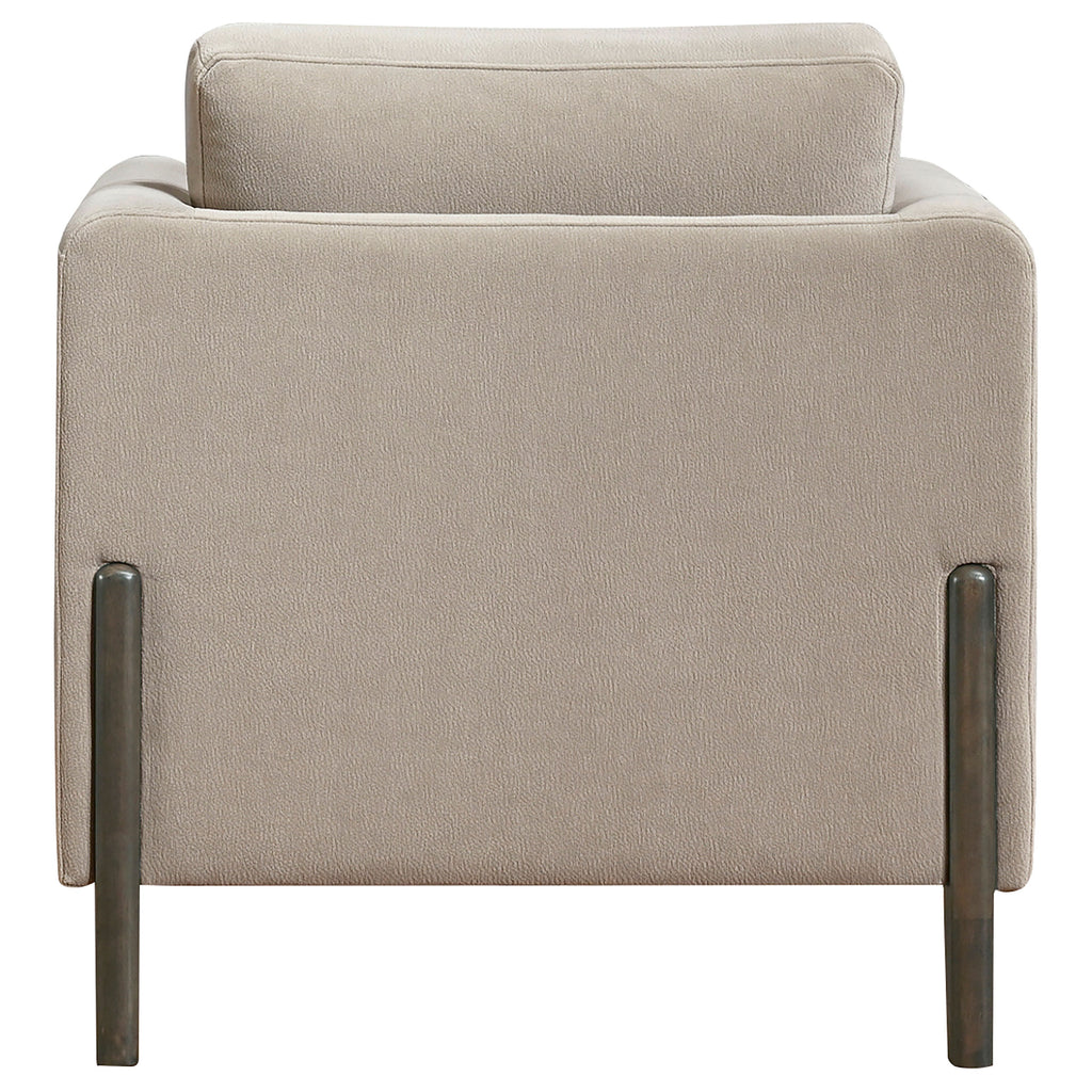 Clean lines and cozy form unite in this upholstered accent chair, a refined piece grounded in simplicity. Framed in engineered wood with a rich coffee finish, its recessed panel arms and low profile evoke modern structure. Soft taupe polyester wraps plush, reversible cushions that offer lasting comfort and flexibility. Designed to coordinate with matching pieces or stand confidently on its own. Key Features: • Accent chair with panel arms and coffee frame delivers a structured, contemporary look • Warm coffee wood frame adds contrast and natural refinement to the design • Soft taupe polyester upholstery offers durability with an inviting texture • Recessed panel arms enhance the architectural silhouette of the chair • Reversible seat and back cushions maintain shape and extend usability • Constructed from engineered wood, fabric, and foam for support and everyday comfort