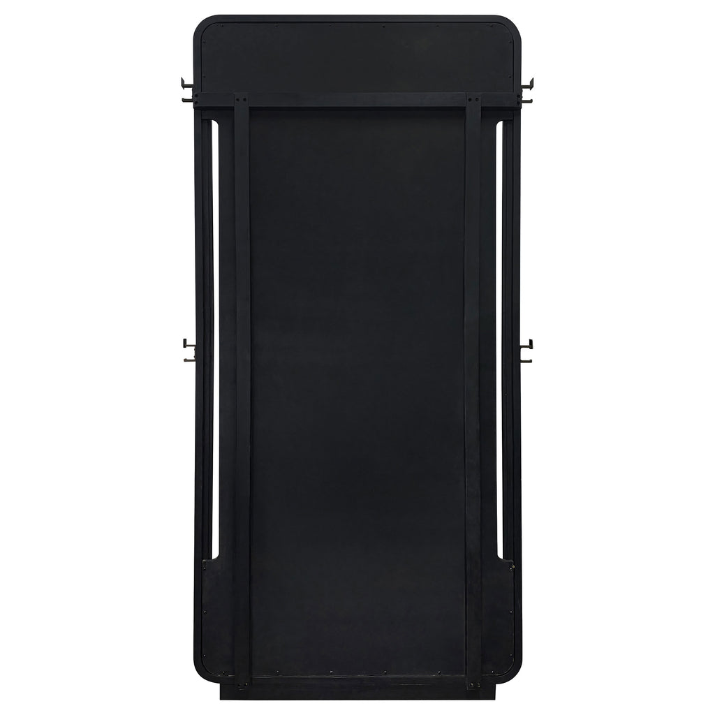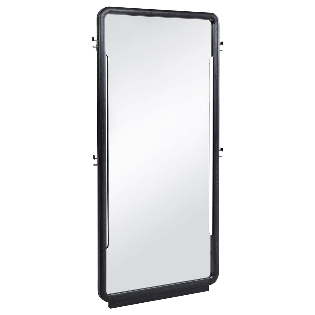 Bold in scale and softly contoured, this full-length floor mirror brings sculptural presence to any room. Framed in a deep burnished black finish with rounded corners, it offers a tall, uninterrupted reflection perfect for everyday use. Designed to lean securely against the wall, it also features integrated side hooks ideal for hanging garments, accessories, or daily essentials with subtle utility and style. Key Features: • Full-length floor mirror with burnished black frame and softly rounded corners • Lean-back design provides secure positioning against the wall without mounting • Tall reflective surface offers complete head-to-toe visibility • Integrated side hooks allow for hanging clothing, bags, or accessories • Sculptural shape and curved edges add subtle design character to any space • Crafted from Asian hardwood, engineered wood, and premium mirrored glass