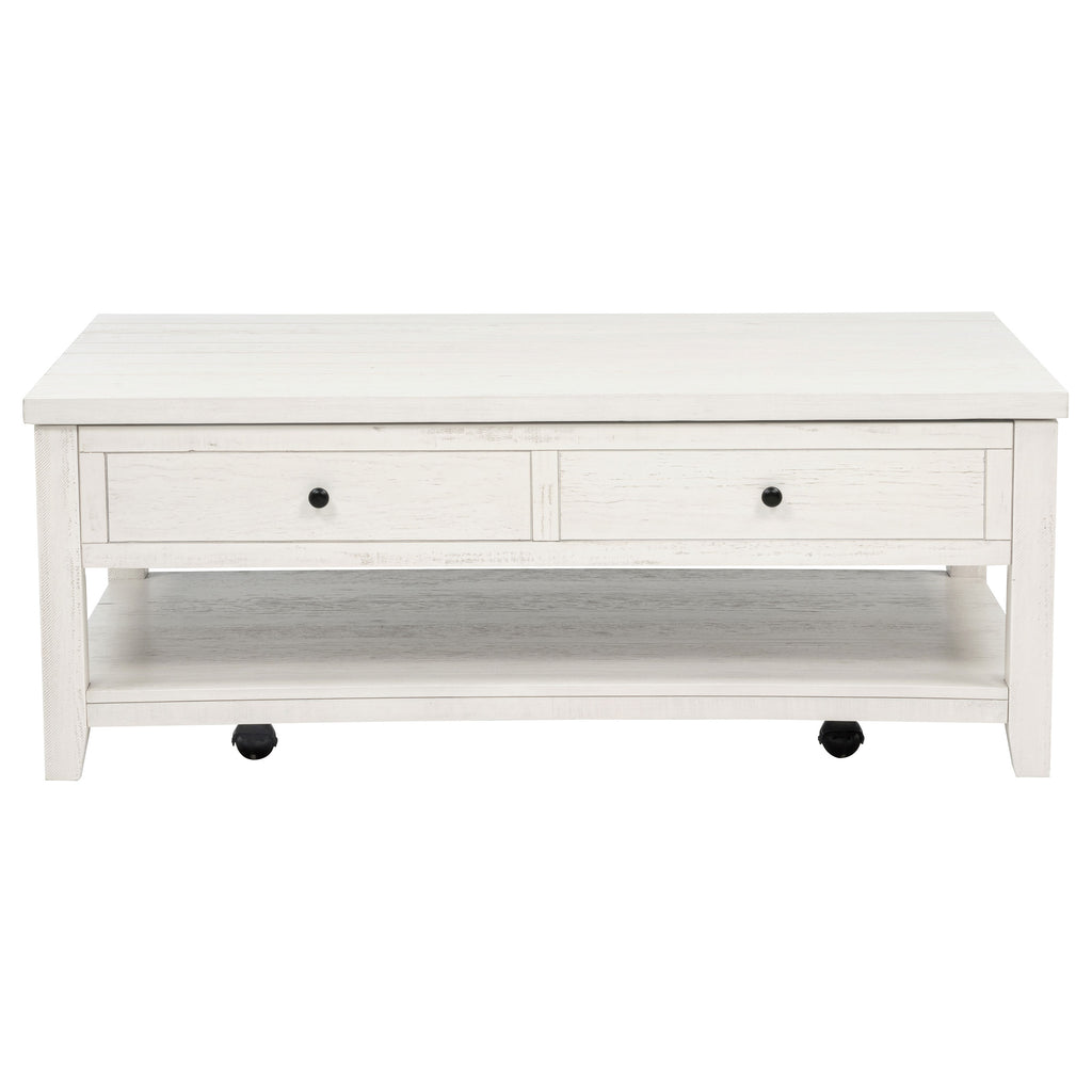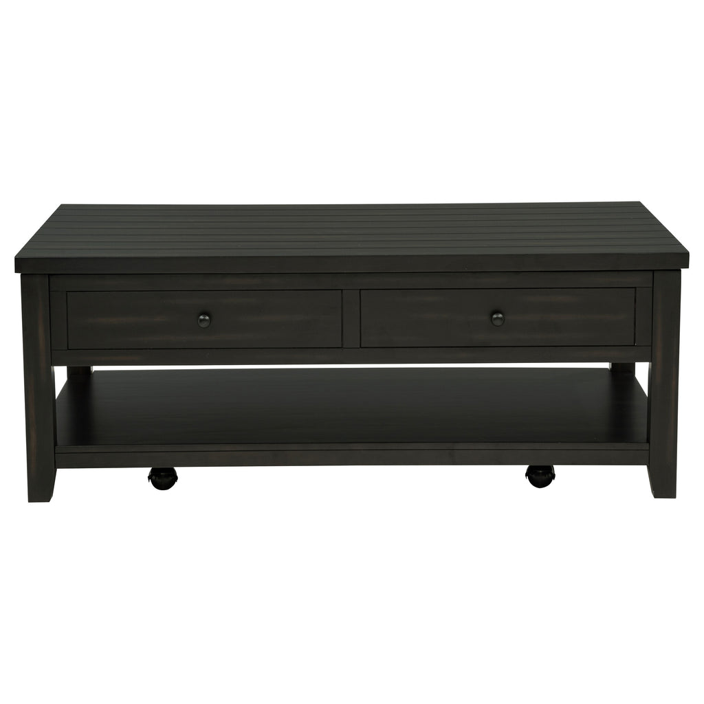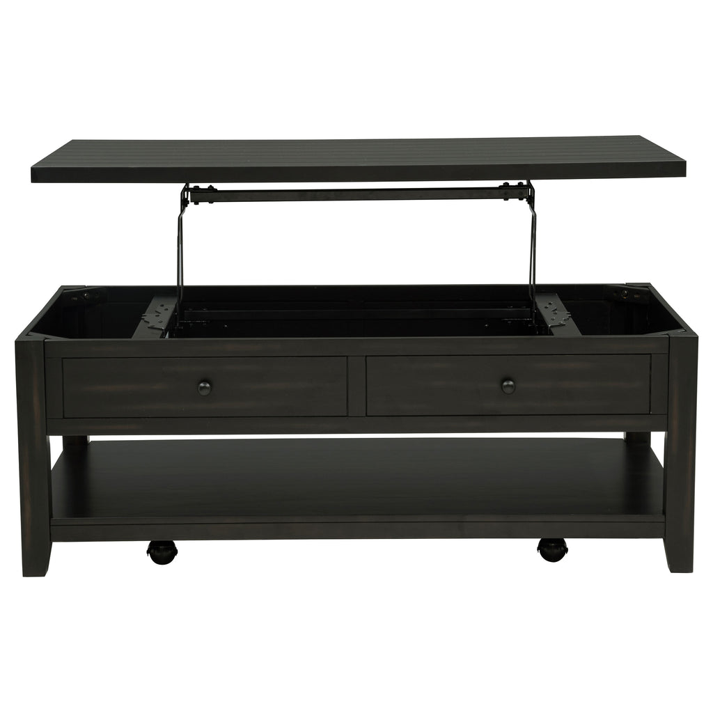Blending versatility and warmth, this lift-top coffee table brings function and charm to everyday living. Its clean, structured silhouette is elevated by a spacious tabletop that rises for dining or work, while interior storage keeps essentials neatly tucked away. A wide lower shelf adds room for display or baskets, and built-in casters ensure effortless mobility. Crafted from pine, veneer, and engineered wood, it offers grounded style with everyday flexibility. Key Features: • Lift-top coffee table with concealed storage and lower shelf for flexible organization • Distressed brown finish reveals warm wood grain with a classic rustic tone • Top surface lifts for dining or laptop use, then lowers smoothly into place • Built-in casters provide seamless mobility for rearranging or cleaning • Black hardware adds a touch of contrast to the rich wood finish • Crafted from pine, pine veneer, and engineered wood for lasting strength