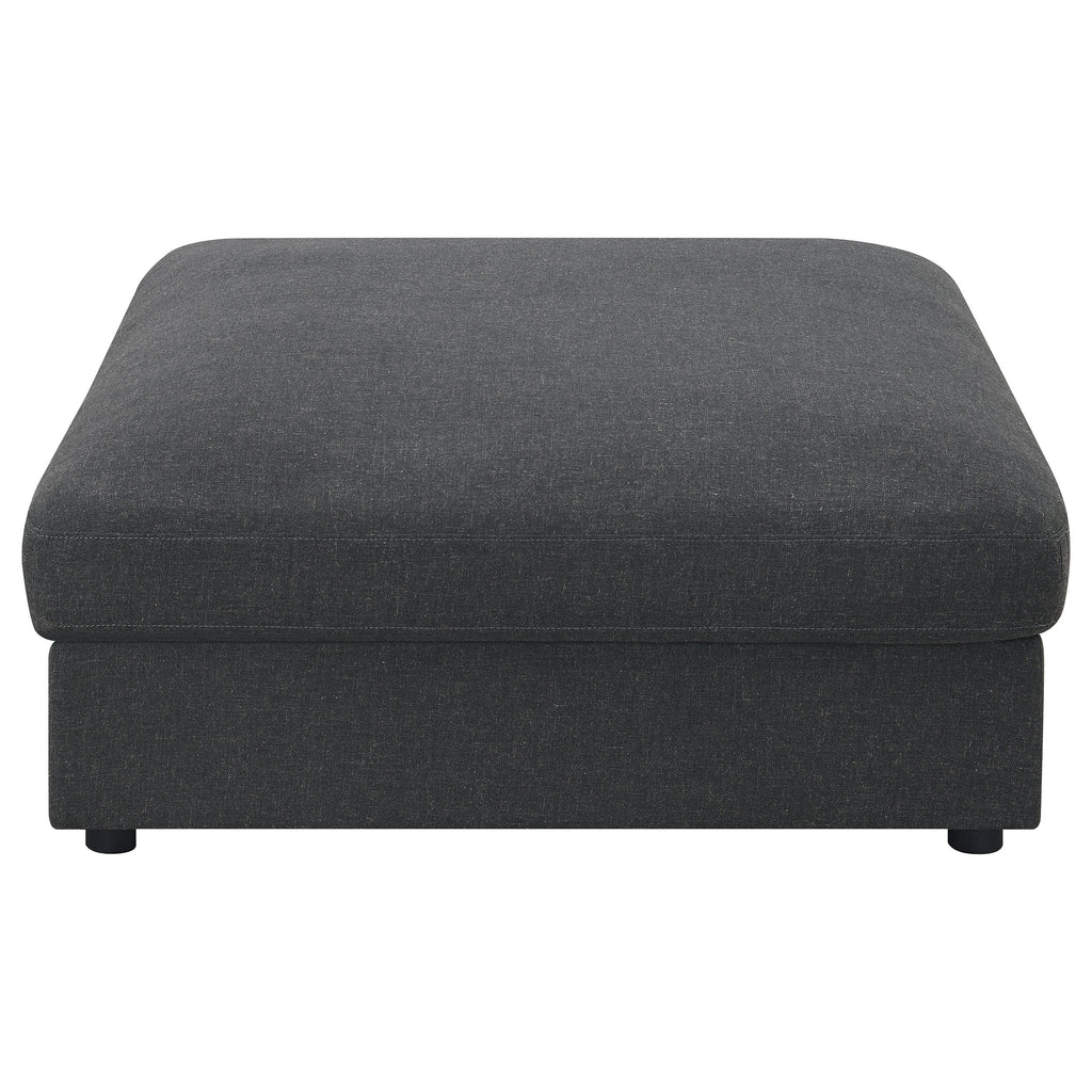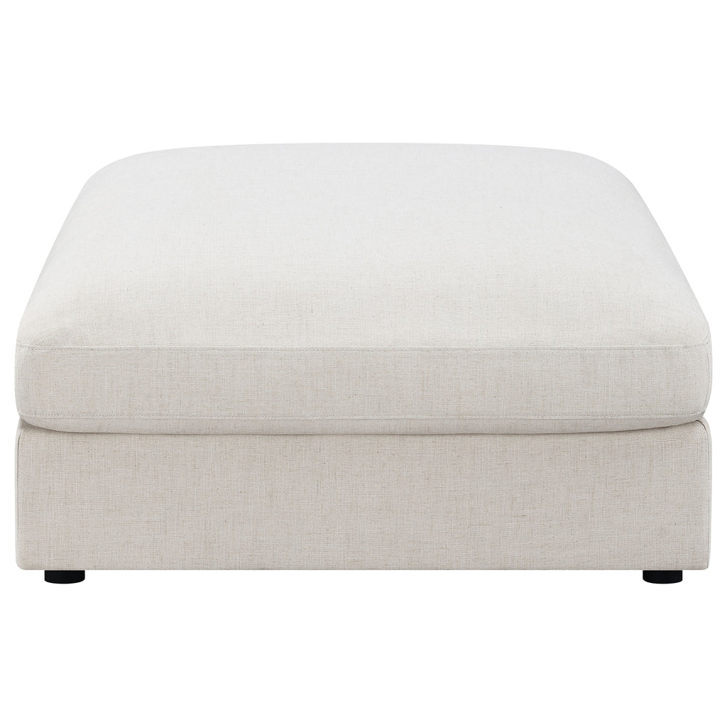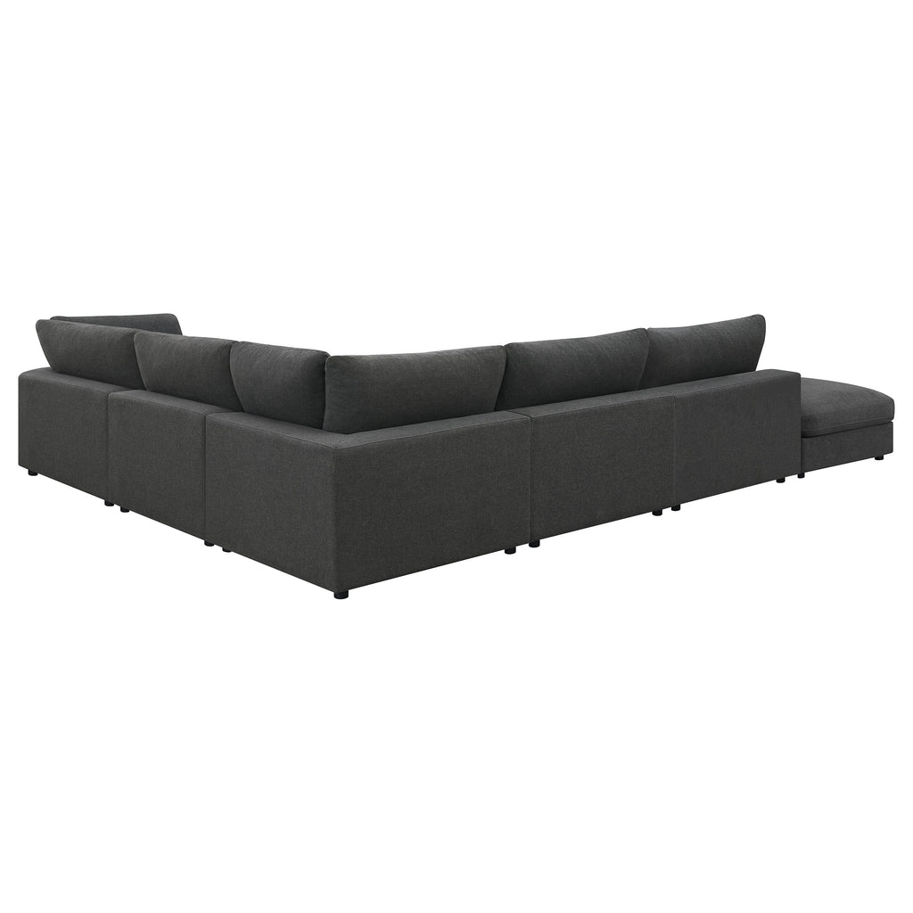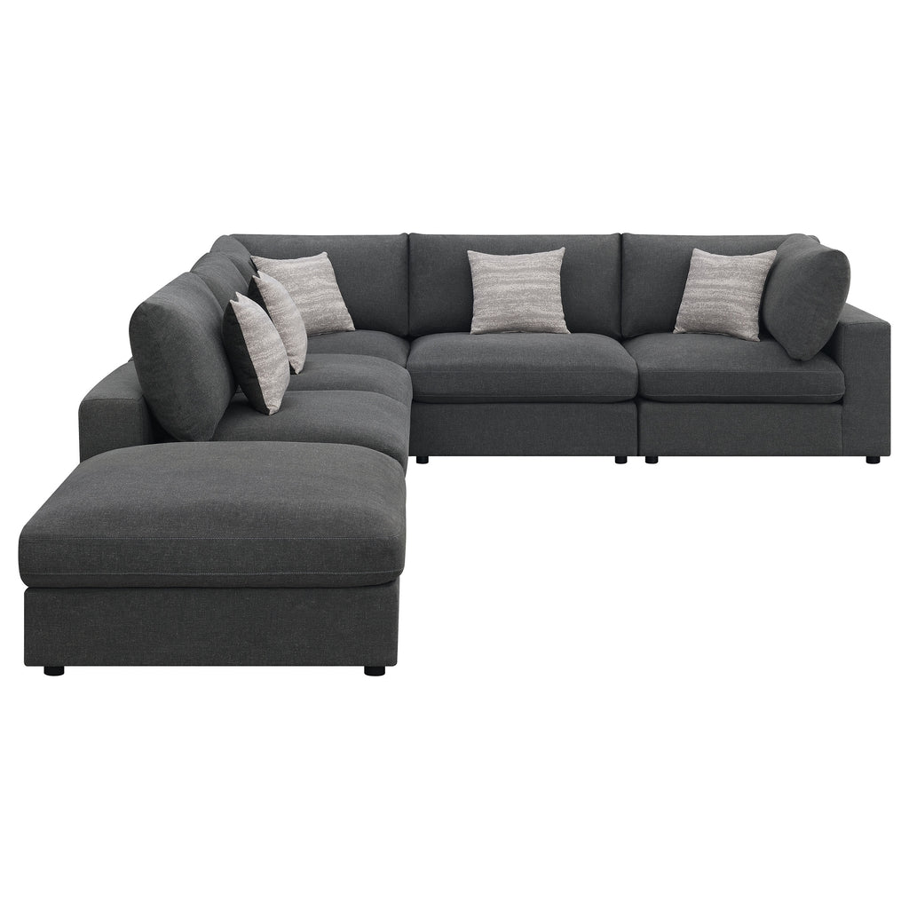 Covered in a linen-like fabric all around, this super comfy five-piece sectional offers all the seating you need in an open concept living room or entertainment area. Designed with two armless chairs, two corner chairs and a single oversized ottoman, this contemporary modular sectional offers reversible back pillows and jacquard accent pillows that you can really sink into. Black feet peer from beneath, offering a slight elevation for rugs and other flooring. With an L-shape design, this sectional works in a variety of room dimensions. A spacious ottoman also doubles as a coffee table, keeping a tray of refreshments and snacks when hosting guests. Key Features: • Experience ultimate comfort with this fashionable sectional • Modular construction allows you to easily build the perfect seating area for your space • Feather blend seat and back cushions for the best seat experience • Accent pillows in a soft jacquard are included • All cushions are reversible making it easy to clean and maintain