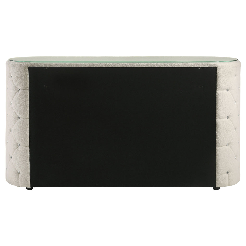 Soft texture meets luminous detail in this statement-making dresser. Wrapped in ivory boucle, the piece features vertical channeling across six spacious drawers, each adorned with crystal-inspired hardware for a hint of sparkle. Diamond tufting along the sides adds depth and dimension, while a clear tempered glass top provides a smooth surface without concealing the luxe upholstery. With its elegant form and functional storage, this dresser elevates everyday routines. Key Features: • Dresser features plush boucle upholstery in soft ivory with vertical channel-detailed drawers • Six drawers provide generous storage for bedroom essentials with easy-access organization • Crystal-style drawer pulls add a glamorous touch and a hint of sparkle • Diamond-tufted side panels bring visual depth and a couture-inspired accent • Clear tempered glass top protects the fabric while offering a durable, polished surface • Crafted from solid rubberwood, engineered wood, boucle fabric, and foam for longevity