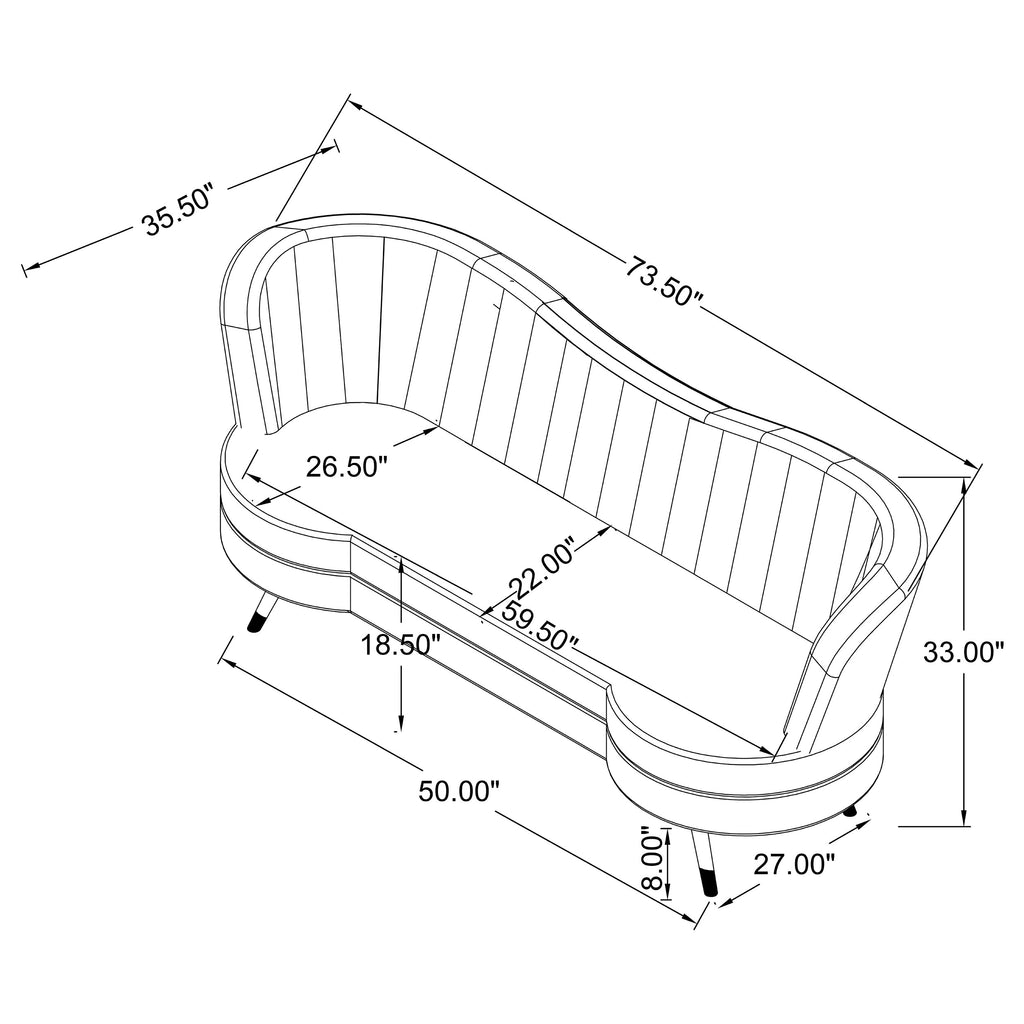 Art Deco never looked so dramatic! This retro-inspired seating set features a vivid deep blue velvet upholstery throughout, complementing by mid century modern style tapered legs in a warm gold hue. Extra details such as channel tufted interior and a vintage kidney-shaped silhouette truly make this seating ensemble one of a kind. A twist on the iconic tuxedo style, this seating group has sleek, slim track arms and an inverted camelback backrest that flows into one another. Boasting a regal aesthetic, each furniture piece offers to be a centerpiece. Key Features: • Sculptural modern glam in a beautiful shade of blue velvet • Both sofa and loveseat feature an inverted camel back creating the right touch of curve appeal • Tailored, vertical channels frame inside back providing a stylish back drop to the kidney shaped attached bench seat • Gold stainless steel tapered legs add the finishing touch