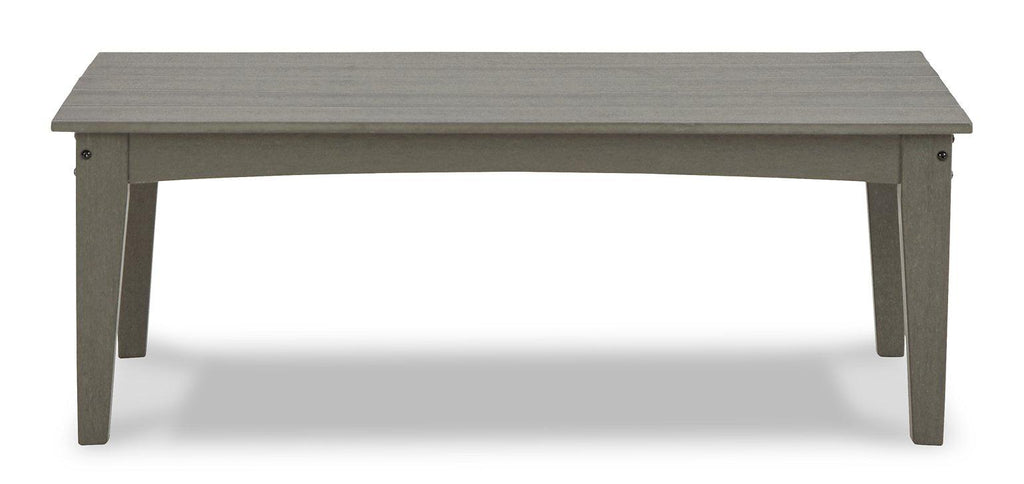 It’s the dawn of a new day for gray. Embrace the style trend with this sofa and coffee table set. Crafted of HDPE material that combines the exceptional durability and weather resistance you need with the "wood look" you love, this timeless set takes alfresco living to a whole new level. The slatted styling on the table naturally sheds rainwater. Thick seat and back cushions on the sofa are wrapped in our exclusive Nuvella® high-performance fabric that’s fade resistant, stain resistant and a breeze to clean.